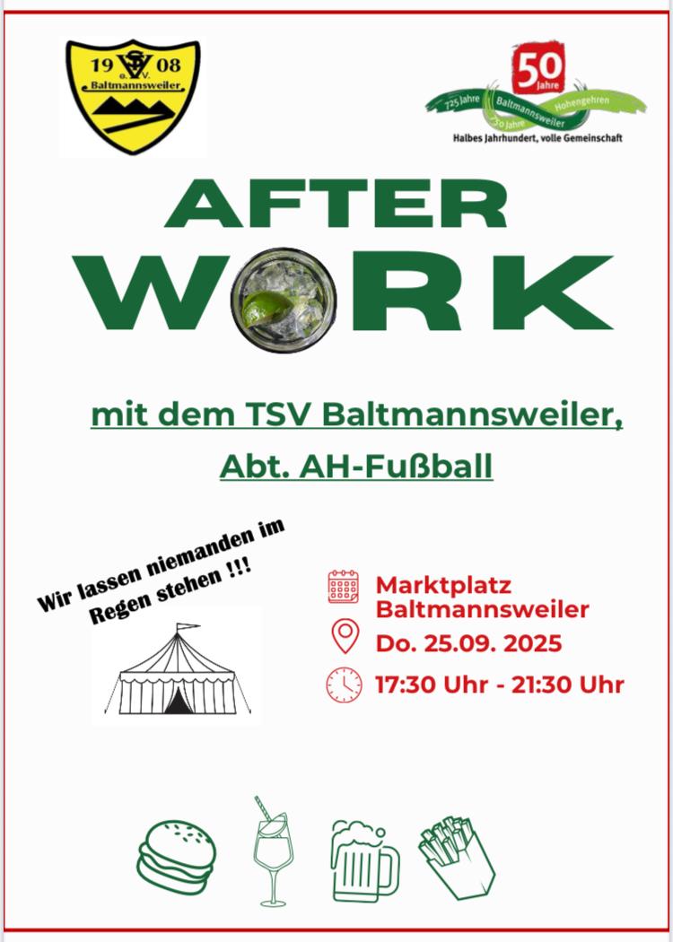 Am 25.09.2025  findet ein weiterer „After Work“ statt. Veranstalter sind diesesmal die AH Fussballer des TSV Baltmannsweiler. Auch bei schlechtem Wetter sind wir vorbereitet und lassen Euch nicht im Regen stehen. Wir freuen uns auf Euer kommen.